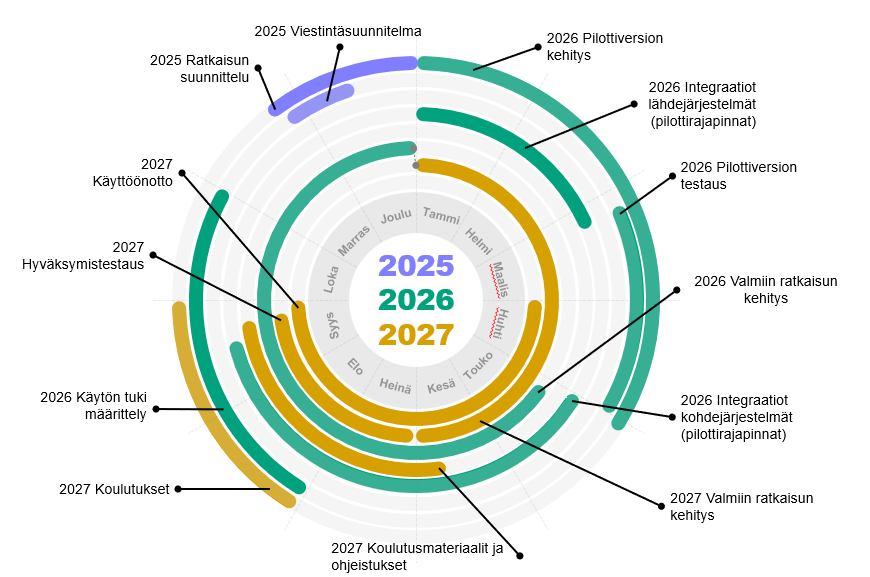 PalveluYdin projekti kestää vuoden 2027 loppuun. Vuosikellon avulla voidaan tarkastella ylätason kokonaiskuvaa tehtyjen ja suunniteltujen kehitystehtävien aikataulusta.